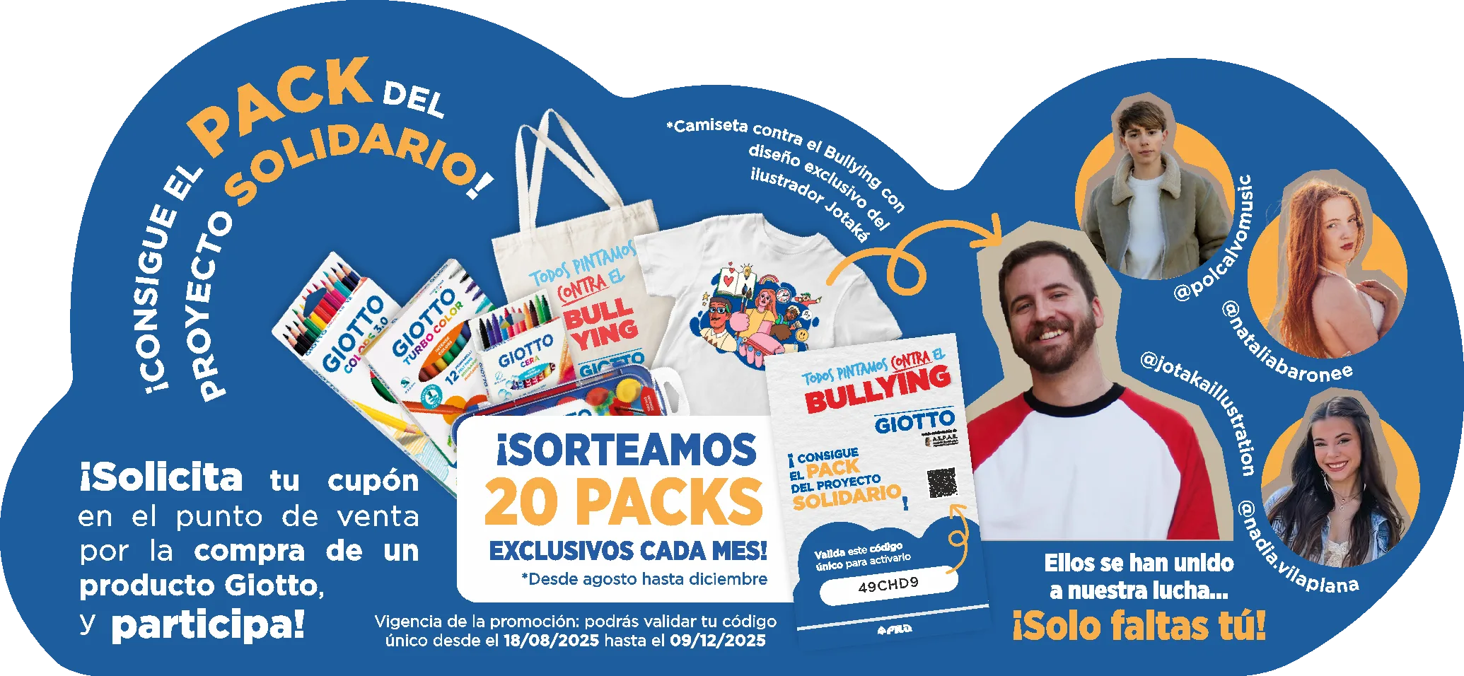 Cada mes sorteamos 20 packs del Proyecto solidario con una camiseta exclusiva con la obra de Jotaká, lotes de productos GIOTTO y muchas sorpresas más.