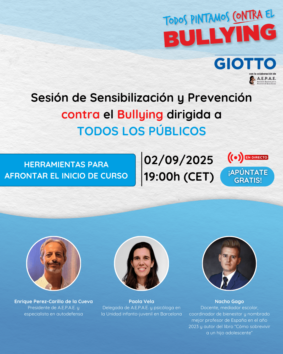 De hecho, 1 de cada 4 estudiantes en España ha sido víctima de Bullying y el 7,7% de las familias afirma que cree que su hijo ha sido víctima. Por ello, GIOTTO, junto con la Asociación Española para la Prevención del Acoso Escolar (AEPAE), realizará una Sesión especial contra el Bullying, dirigida a todos los públicos, el día 2 de SEPTIEMBRE, a las 19:00 h (GMT).